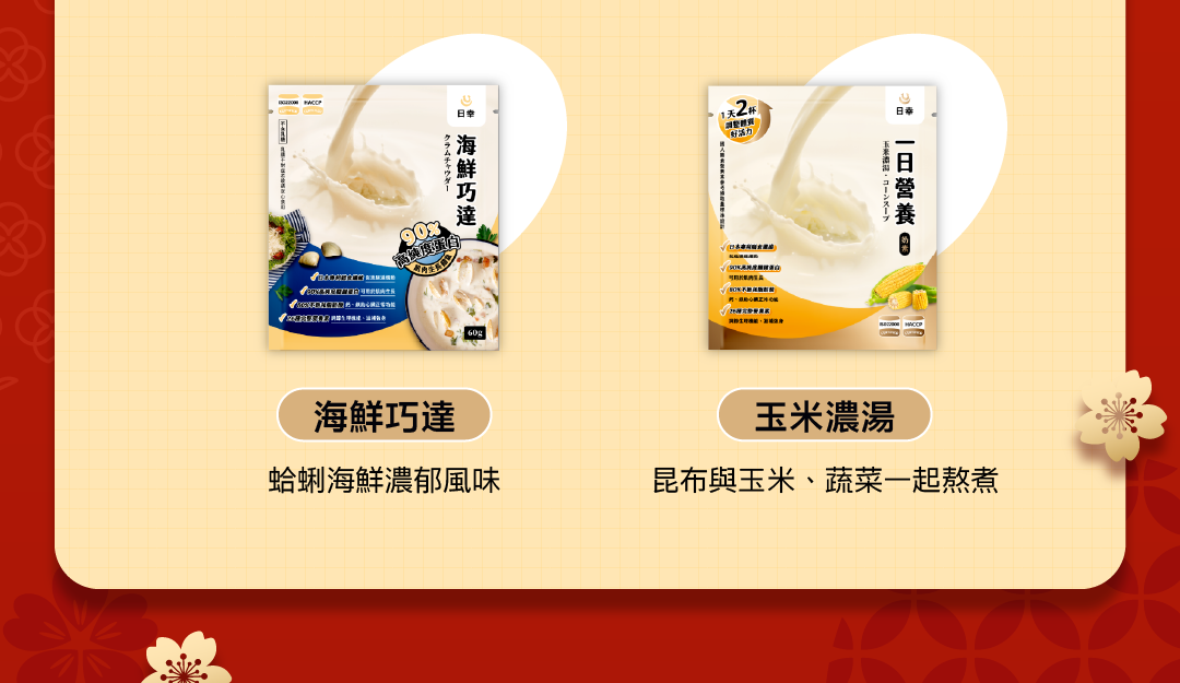 (玉米濃湯、海鮮巧達、蒜頭雞湯、四神湯)